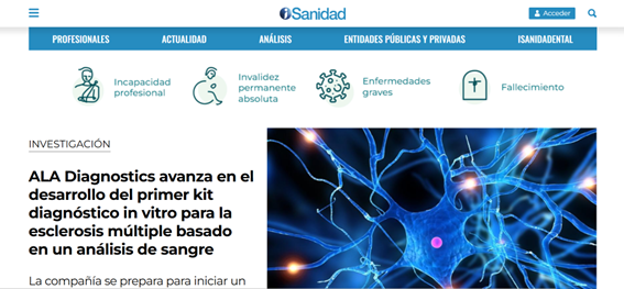 ALA Diagnostics avanza en el desarrollo del primer kit diagnóstico in vitro para la Esclerosis Múltiple basado en un análisis de sangre